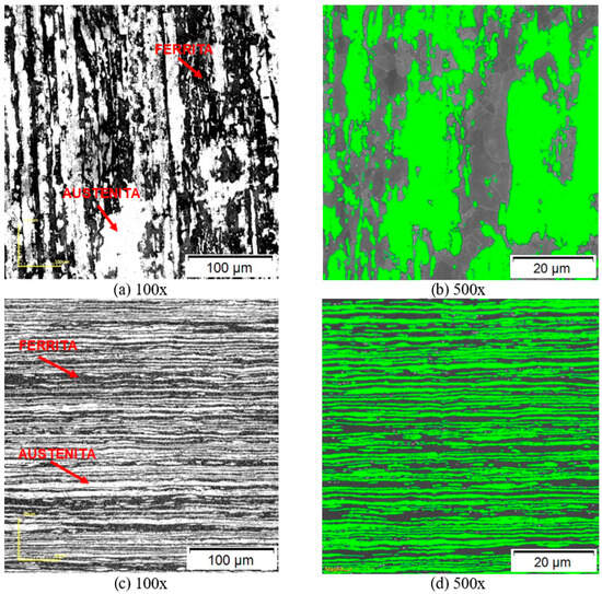 The quantitative analysis of the phases, determined by the contrast of the images, as in Figure 1b,d is presented in Table 1. Note that the duplex stainless steel S31803 has an approximate balance of 50 vol% of the austenite and ferrite fractions, in both senses evaluated. According to the literature [4,24,28], the percentage of austenite and ferrite phases present in the microstructure of duplex stainless steels must be balanced and may have a minimum fraction of up to 40 vol% of austenite.