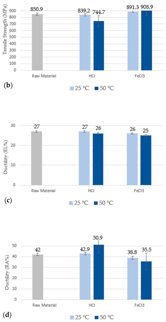 Values of yield strength (a), tensile strength limit (b), EL% ductility (c), and RA% ductility (d) obtained from the tensile test.