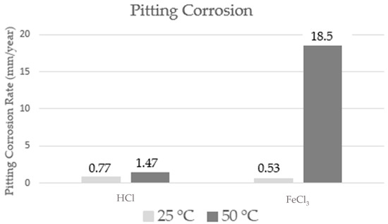 The pitting corrosion rate values, determined for the samples subjected to hydrochloric acid and ferric chloride media, at temperatures of 25 and 50 °C, are shown in Figure 5. Regarding the qualitative analysis, all specimens presented values for the pitting corrosion rate which are classified as showing severe-type corrosion (>0.38 mm/year), according to NACE RP 0775 [18].