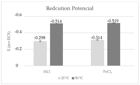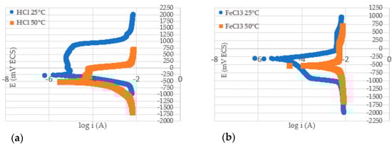 The curves obtained from the potentiodynamic polarization test and the values of the reduction potential, determined for duplex stainless steel S31803 in hydrochloric acid and ferric chloride medium, at temperatures of 25 and 50 °C, are shown in Figure 6 and Figure 7. The potentials found for the HCl solution, at temperatures of 25 and 50 °C, were −0.289 V ± 0.006 and −0.514 V ± 0.013, respectively, while for the FeCl3 solution, they were −0.314 V ± 0.017 and −0.519 V ± 0.050, respectively. Colli [28] presented potential values from the potentiodynamic corrosion technique in 1M HCl solution at different temperatures. At a temperature of 30 °C, a potential around −420 mV was determined, at a temperature of 40 °C, a potential of −470 mV was determined, and at a temperature of 50 °C a potential of −490 mV was determined. These values are comparable with the results obtained.