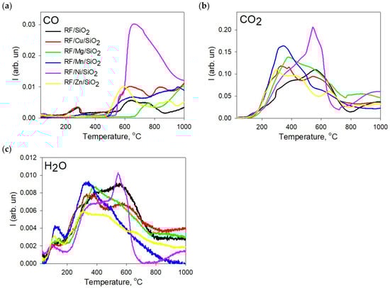 The nature of the change in the intensity of these peaks until the end of the heat treatment is different for each sample, indicating that the metals have a significant influence on the process of polymer pyrolysis. In Figure 2, the TPD spectra of the main gaseous products of the pyrolysis of resorcinol–formaldehyde resin modified with metal oxide/silica nanocomposites are presented. It should be noted that H2O is released over the entire temperature range. The spectra show CO as an additional product released by the thermal decomposition of the phenol groups. It is noticeable that the emission of CO gas at 150 °C is higher from the RF/SiO2 sample (Figure S1) than for the modified polymer composites, while the temperature at which it occurs is shifted to the high-temperature range and increases by 100 °C in the series Ni < Cu < Mg < Zn < Mg. Thus, the main volatile products during the pyrolysis of the resorcinol–formaldehyde polymer are CO, CO2 and H2O. According to the bond strength data, these decomposition reactions may involve the breaking of C-O bonds at the lower temperature and the breaking of C-H bonds at the higher temperature []. The main weight loss at this stage begins with the breaking of the methylene bonds of the main chains with the simultaneous release of carbon dioxide and carbon monoxide in the form of gaseous products. They can be formed by the complete decomposition of the benzene ring, which can take place at up to 1200 °C. This cracking process leads to the breakdown of small fragments and the formation of free radicals. These free radicals are then either recombined or abstracted from the three-dimensional hydrogen or oxygen residue, which gradually leads to an increasing carbonization of the residue. It is confirmed that the degradation of the three-dimensional network begins by the breakdown of methylene bridges, followed by breaks in the phenolic functions [].