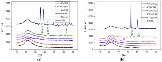 It is known that metals are catalysts for the formation of highly ordered carbon structures. In particular, Ni and Co were previously shown to promote the formation of the graphite phase in the carbonization of organic substances by enhancing the formation of a more ordered nanographite phase []. In the present series, Mn and Cu were shown to most actively influence the thermo-oxidative destruction of carbon (Figure 7b). The temperatures of oxidative destruction decreased by 150–230 °C compared to the control sample C/SiO2. According to the maximum rates of weight losses on the DTG curve, it can be concluded that the promotion of metals in the catalytic oxidation of carbon increases in the line Mn < Cu < Mg < SiO2 < Zn < Ni. The calculated carbon content in the samples was 36–48 wt.%. In addition, the obtained data on the carbon content in the samples indicate that, in a number of metal-containing samples, nickel and zinc promote the formation of the carbon phase (Table 4).