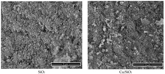 A typical preparation of MxOy/SiO2 oxide nanocomposites (where M is Cu, Mg, Mn, Ni and Zn) consists of three steps. In the first step, the homogeneous dispersion of silicon dioxide was prepared in the aqueous solution of the corresponding metal acetate, with an estimated ratio of the components under stirring at room temperature. The content of the metals was 3.0 mmol/g SiO2. In the second stage, the dispersions were dried at a layer thickness of 4–7 mm at 130 °C for 5 h, then ground in a mortar and sieved through a sieve with a mesh size of 0.5 mm. In the third and final stage, all the powders obtained were calcined in air at 600 °C for 2 h. The reference sample of fumed silica was treated in the same three steps: homogenization of the aqueous dispersion, drying, grinding, sieving and calcination at the same temperature.