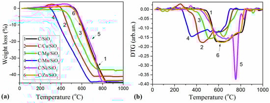 (a) TG and (b) DTG curves of carbonized C/M/SiO2 composites.