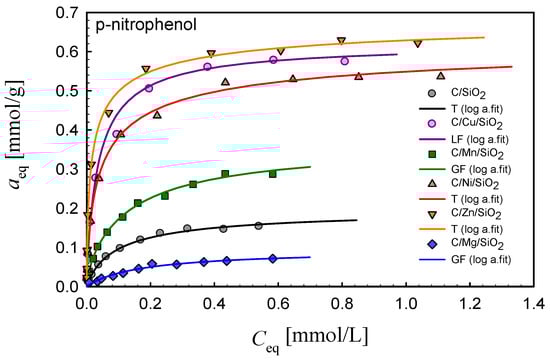 In order to estimate the adsorption properties of the synthesized composites toward aromatic compounds, the adsorption isotherms of 4-nitrophenol (Mw = 139.11 g/mol, pKa = 7.25, cs = 12.1 g/L) and 4-chlorophenol (Mw = 128.55 g/mol, pKa = 9.38, cs = 27.1 g/L) were measured. Analyzing the isotherms presented in Figure 8 and Figure 9, one can generally find that the metal nanoparticles promote the adsorption of selected organics in the case of most systems in comparison to the composite C/SiO2. The only exception is found for the composite containing magnesium, C/Mg/SiO2. For all investigated systems, the maximum adsorption values are differentiated in the range ~0.1–~0.7 mmol/g depending on the metal nanoparticles incorporated into the composite structure. Such differentiation in adsorption uptakes for the synthesized composites indicates the possibility of designing materials of divergent adsorption selectivity adopted for specific applications.