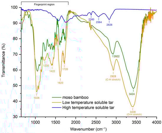 The functional groups of the bamboo and different bio-tars were analyzed with a Fourier Transform Infrared Spectrophotometer (Nicolet iS20, Thermo Fisher Scientific, Waltham, MA, USA). Samples were prepared by tableting the mixture of bamboo or tar with KBr (where a 1–2 mg sample was mixed with 100 mg of KBr and then pressed into a transparent film). The resolution of the FTIR was 4 cm−1, and each spectrum was composed of 64 scans. Transmittance was measured with wavenumbers from 650 to 4000 cm−1. Before each measurement, the baseline was corrected and the spectra were normalized.