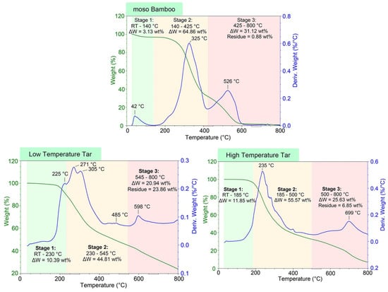 The thermal behavior (TG and DTG curves) of the moso bamboo and two different soluble bio-tars during pyrolysis is shown in Figure 3. The moso bamboo and its soluble bio-tars showed totally different pyrolysis properties. In general, the pyrolysis process of the moso bamboo and two different soluble bio-tars was divided into three stages according to the weight loss rate. For comparison, the thermo-degradation property of the moso bamboo was first analyzed. As a kind of typical biomass, the three pyrolysis stages of moso bamboo are similar to other biomasses. The percent of mass decreased by about 3 wt% below 140 °C due to the release of bound water in the sample [24]. The thermal decomposition of organic composition was therefore deemed to have started at 140 °C and including two main peaks, shown in Figure 3. In the temperature range of 140 °C and 425 °C, the degradation of hemicellulose first took place, followed by cellulose and lignin with a weight loss of 64.86 wt%. Jiang et al. also confirmed a 68.69 wt% mass loss of moso bamboo pyrolysis at between 177 °C and 377 °C [25]. Wang et al. summarized the mechanisms of cellulose, hemicellulose, and lignin pyrolysis, indicating that the peak temperature of hardwood and straw is in the range of 274–291 °C. The minimum temperature for the decomposition of cellulose crystals is greater than 300 °C, and the glass transition temperature of amorphous cellulose is 243–307 °C [26]. Our DTG results showed that the peak temperature of the moso bamboo was 325 °C, resulting from the overlapping decomposition of hemicellulose and cellulose, with the latter playing a more important role. Lignin decomposition occurred over a wider temperature range. The β-O-4 linkages in lignin can be cleaved at 200–250 °C, and the decomposition of other linkages and side chains lasts until 800 °C. The degradation of the stable lignin of the moso bamboo in the third stage emerged with a weight loss peak at 526 °C. The decomposition of the moso bamboo was generally completed before 650 °C. Weight loss in the temperature range of 650–800 °C could be neglected. The residue that remained in the crucible was as low as 0.88 wt% of the original moso bamboo [25], as the inner and outer skin of the moso bamboo used in this study had already been removed.