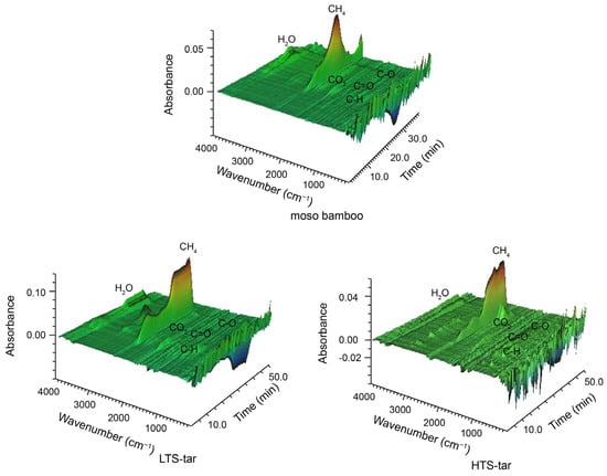 The infrared spectrum is often used to distinguish various inorganic and organic compounds during the pyrolysis process. Commonly detected pyrolysis products included non-condensable gases, such as CO, CO2, and CH4, and condensable volatiles, such as H2O, methanol, acids, and phenols [25]. Figure 4 shows a three-dimensional plot of the spectra obtained from the evolved gases during the pyrolysis of the moso bamboo and two different soluble bio-tars. The height of absorbance qualitatively reflects the concentration of the product in the volatile mixture. The main gaseous products and chemical linkages identified in the spectra included H2O, CH4, CO2, C-C, C=O, and C-O. The C=O linkage mainly existed in the carboxylic acid and esters, while the C-O linkage appeared in the alcohols. The compositions of the mixed volatile gases from the moso bamboo and bio-tars were different from each other, with different evolving characteristics.