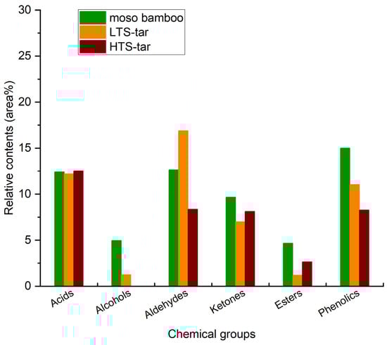 The organic chemicals analyzed in the pyrolysis products from the moso bamboo and bio-tars were divided into eight groups: acids, alcohols, aldehydes, ketones, esters, phenolics, sugars, and others. The relative contents of the chemical groups are shown in Figure 6. The most abundant single compound was acetic acid, which accounted for 11.59%, 11.34%, and 2.26% of the moso bamboo, LTS-tar, and HTS-tar. Acetic acid is commonly identified as a main component, with concentrations up to 10% in bio-oil, and it is a good building block for chemical production [4]. However, the HTS-tar in this study contained 10.27% 4-hydroxy-3,5-dimethoxy benzene acetic acid, whereas the other two samples contained less than 1%. This was probably due to the chemical reaction of the phenolic compounds and acids under high temperatures during extended steam pretreatment. Alcohols were found in both the moso bamboo and LTS-tar, as they had both carbohydrates, which was also confirmed by previous FTIR results.