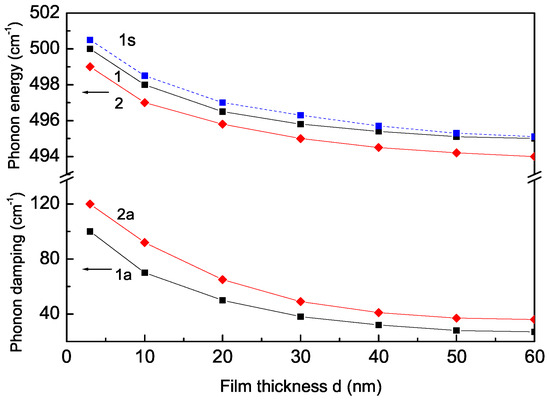 Firstly, we investigate the phonon energy and damping for the A1g mode, = 495 cm−1, in pure and Sr-doped free LMO thin films. The film thickness dependence of the phonon mode for a pure (x = 0) LMO thin film is calculated. It must be noted that the oxygen excess in LMO films is compensated by a mixed valence state of the manganese cation (Mn3+/Mn4+). The exchange interaction constants on the two free surfaces (n = 1, N) are different from those in the bulk J; they can be larger or smaller. We have chosen the relation , because Kharlamova et al. [29] have reported that, in LMO nanoparticles, the unit cell volume decreases. Then, through the spin–phonon interaction, we have , . The phonon energy , which corresponds to the Raman peak position, increases with the decreasing film thickness d, and the distance between the layers is taken to be around 1 nm (see Figure 1, curve 1). This means that the Raman mode positions shift towards a higher frequency compared to the bulk single crystal reported for pure LaMnO3 thin films [15]. The results show a remarkable difference in the phonon energies with the thickness. This behavior can be explained on the basis of the surface strain, which increases with decreasing thickness. As the thickness is increased, the phonon energies appear close to those of the single crystal.