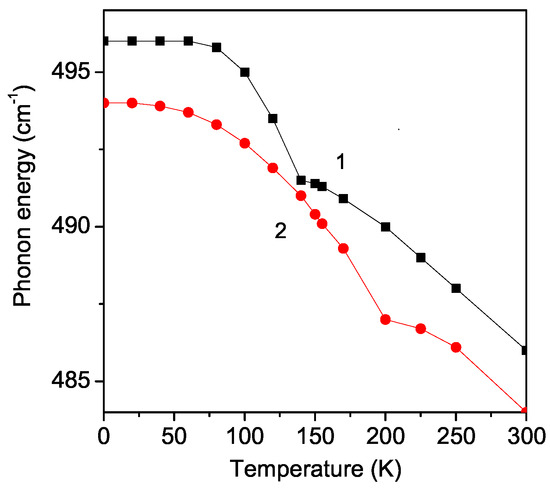 Temperature dependence of the phonon energy of the A1g mode = 495 cm−1 in (1) pure and (2) Sr (x = 0.1) doped LMO thin film, d = 20 nm.