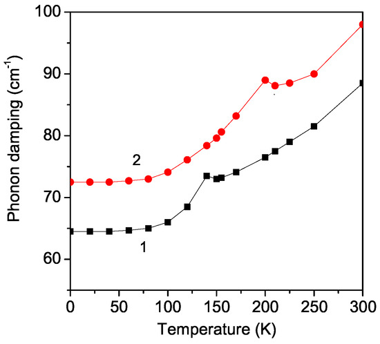 The phonon damping increases with temperature T (see Figure 5). There is again an anomaly around the phase transition temperatures: T = 140 K for the undoped case and T = 225 K for the Sr-doped LMO thin film for x = 0.1. It must be mentioned that is larger in the doped case compared to the undoped one for both cases—negative and positive (compare with Figure 4)—because the damping is proportional to ; see Equation (9). This behavior is due to the strong spin–phonon interaction R. An alternative means to observe the hardening of the phonon mode is the decrease in the Jahn–Teller distortion with increasing doping concentration x [13,36]. The reduction in the Jahn–Teller distortion in Sr-doped LMO has the same effect on the phonon energy as the change in the crystal symmetry due to the temperature-induced phase transition. This assumption is also confirmed by the polarized Raman spectra of doped crystals reported by Podobedov et al. [37]. Temperature-dependent Raman characterization has shown a metallic phase with a total reduction in the Jahn–Teller distortion in the rhombohedral La0.67Sr0.33MnO3 nanoparticles [18].