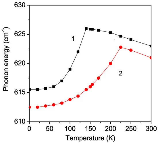 Temperature dependence of the phonon energy of the B2g mode = 614 cm−1 in (1) pure and (2) Sr (x = 0.1) doped LMO thin film, d = 20 nm.