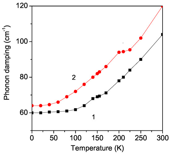 Temperature dependence of the phonon damping of the A1g mode = 495 cm−1 in (1) pure and (2) Sr (x = 0.1) doped LMO thin film, d = 20 nm.