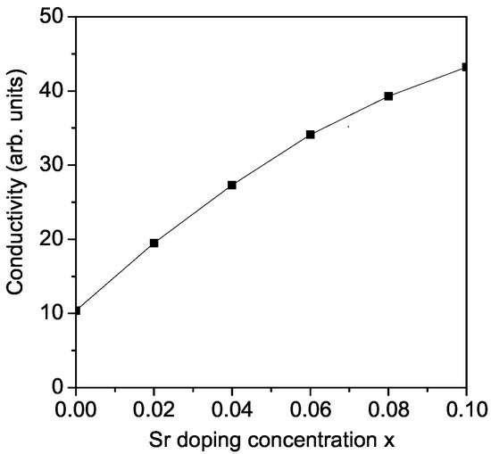Among perovskites with an ABO3 structure, LMO is well known for solid oxide fuel cell (SOFC) applications. Strong electrical conductivity is necessary for the compound to serve as a cathode in SOFCs. Therefore, the doping of alkaline earth metals at the A-side enhances the electrical conductivity of the material [39]. Finally, from Equations (12)–(14), we have calculated the Sr concentration dependence of the electrical conductivity in an LMO thin film, d = 20 nm, T = 750 K. The substitution of La3+ with Sr2+ with a larger ionic radius favors both the crystal symmetry and the electrical conductivity of LMO. The results are presented in Figure 6. It can be seen that is enhanced when increasing the dopant concentration x; thus, it could be used for energy applications. This behavior is in qualitative agreement with the recently reported experimental results of Gupta et al. for Sr-doped LMO nanoparticles [4]. It must be noted that Gupta et al. [4] observed the highest increasing for x = 0.15. A similarly enhanced was obtained in Sr (on the La site) and Fe (on the Mn site) doped LMO by Shafi et al. [40] and transition metal-doped LaMnxO3 (M = Fe, Co, Cr, Mn) [41]. Recently, He et al. [42] studied the electrical conductivity in Sr-doped LaMO3 (M = Al, Ga, In, Er and Y) under varying oxygen partial pressures.