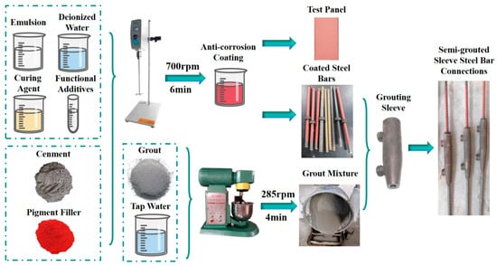 The above studies indicate that there is relatively limited research on polymer cement-based coatings in the field of steel bar anti-corrosion coatings. Most studies primarily focus on the tensile properties, basic physical properties, and water resistance of the coatings, with very few studies addressing corrosion resistance. Furthermore, there is a lack of detailed research on the bond strength between the coatings and the steel bar as well as the concrete. The objective of this study is to develop a novel composite anti-corrosion coating specifically designed for prefabricated construction steel bars. Building upon the basic formulation of the coating, further research was conducted to investigate the impact of emulsion, pigment filler, and dispersant dosage on the corrosion resistance properties of the coating. To ensure that the coating has a certain degree of corrosion resistance properties without compromising the bond strength with the steel bar and concrete, a comparative analysis was conducted on the failure modes, load-bearing capacity, and deformation capacity of bare steel bars samples, epoxy-coated steel bars samples, and polymer cement-based composite anti-corrosion coated steel bars samples in semi-grouted sleeve steel bar connections. Furthermore, the microscopic morphology of the coatings was observed using a scanning electron microscope (SEM), and the types of hydration products of cement and the composition of functional groups in the coatings were characterized using a Fourier transform infrared spectroscopy (FTIR). The study explored the mechanism of action of emulsions and functional additives on anti-corrosion coatings, providing data support and theoretical basis for subsequent research on polymer cement-based composite anti-corrosion coatings.