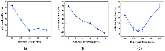 Effect of different raw material dosage on the rate of coating adhesion loss. (a) Effect of emulsion dosage. (b) Effect of pigment filler dosage. (c) Effect of dispersant dosage.