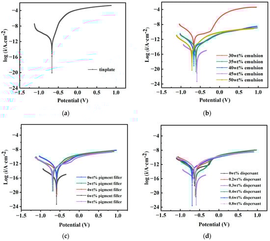 Polarization curves of coated test plates made of tinplate and different raw material dosages. (a) Polarization curve of tinplate. (b) Polarization curve of different emulsion dosages. (c) Polarization curve of different pigment filler dosages. (d) Polarization curve of different dispersant dosages.