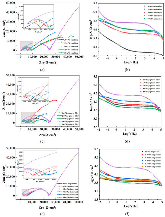 From Figure 4a,c,e, it is evident that the Nyquist plots of coatings made from different raw material dosages exhibit a characteristic of double capacitive arcs, including high-frequency and low-frequency capacitive arcs, indicating reactions between the corrosive medium and the substrate through the coating during the corrosion process. The high-frequency capacitive arc reflects the difficulty of electron transfer between the coating and the corrosive medium. It can be observed that with an increase in the dosage of each raw material, the impedance radius generally follows a trend of initially increasing and then decreasing. This indicates that the addition of each component in either small or excessive amounts can affect the anti-corrosion effectiveness of the coating. When the emulsion, pigment filler, and dispersant dosages are 45 wt%, 6 wt%, and 0.30 wt%, respectively, the impedance radius is significantly greater than that of other formulations, indicating that electron transfer between the coating and the corrosive medium is most difficult under this condition, making corrosion reactions relatively more challenging compared to other formulations.