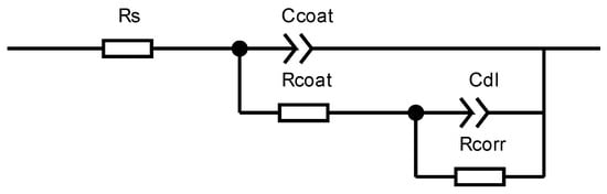 In order to provide a clearer reflection of the corrosion status of the coatings, impedance spectra were fitted using CSstudio5 software, employing an equivalent circuit as illustrated in Figure 5. Herein, Ccoat represents the capacitance of the coating itself, Rcoat denotes the resistance of the coating, Cdl signifies the double-layer capacitance at the metal surface beneath the coating, and Rcorr represents the impedance of the electrode reaction when the solution permeates the coating and reacts electrochemically at the metal surface. The fitted value of Rcoat is presented in Table 4.