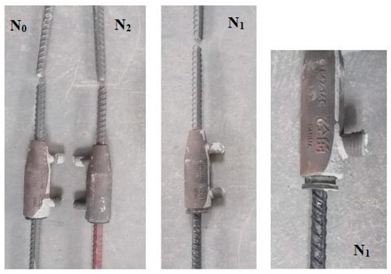 The damage morphology of each semi-grouted sleeve steel bar connection sample is illustrated in Figure 6. It can be observed that connection samples N0, N1, and N2, prepared using bare steel bars, epoxy-coated steel bars, and polymer cement-based composite anti-corrosion coated steel bars, respectively, all experienced failure after unidirectional tensile testing. In each sample, the threaded connection end of the steel bar underwent tensile fracture. Additionally, in sample N1, the steel bar at the rubber ring fixing end was pulled out.