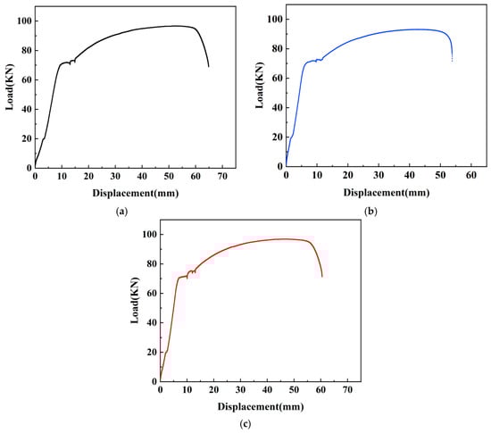 Upon observing the load-displacement curves of each sample, it becomes evident that the overall pattern of change in each curve is quite similar, which can be divided into four stages: the first stage (elasticity stage), belongs to the initial loading phase where there exists an approximately linear relationship between load and displacement; as displacement increases, so does the load. The second stage (yielding stage), the yielding plateau occurs, with slight fluctuations in load and instances of displacement increase without significant load changes. The third stage (strengthening stage), both displacement and load of the sample continue to increase, but the curvature of the curve gradually decreases, approaching a horizontal position. The load gradually reaches its limit. The fourth stage (necking stage), noticeable thinning occurs on the sleeve connected to the steel bar, displaying necking behavior, the load decreases in a linear manner, and the steel bar is pulled off.