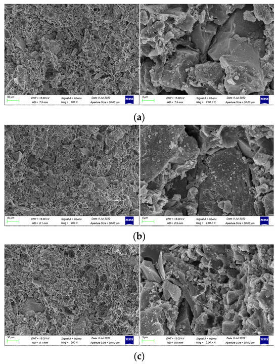 As depicted in Figure 8c, it is evident that the polymer emulsion tightly envelops the cement particles and continues to solidify into a film-like substance, resulting in an increased thickness of the cement hydration layer. This impedes the cohesion between cement particles, slowing down the rate of cement hydration and hindering the hydration process. Moreover, due to the high viscosity of epoxy resin, air bubbles are introduced during agitation, leading to the presence of numerous pores on the surface of the coating and a more porous internal structure [].