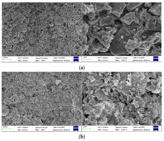 From Figure 8b, it can be observed that a significant portion of the epoxy resin has cured into an amorphous film, with some of it filling the voids generated by cement hydration and the rest covering the non-hydrated cement particles. This enhances the compatibility between cement hydration products and cement particles, resulting in a denser internal structure of the coating and enhanced coating performance [,,].