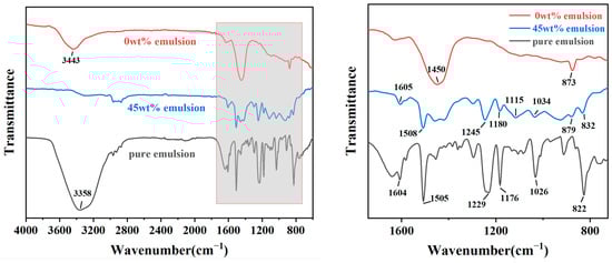 - The peaks observed in the range of 3358 cm−1 to 3443 cm−1 are attributed to the stretching vibration peaks of O-H bonds, mainly caused by residual water molecules in the samples. Pure emulsion contains more water, thus exhibiting a significantly higher peak intensity compared to the other two samples. The intensity of the peak in the coating with 0 wt% emulsion content is also higher than that with 45 wt% emulsion content. This phenomenon can be ascribed to the enhanced compactness of the coating after the epoxy resin is incorporated into the cement-based coating, as the curing of epoxy resin forms a film, thereby reducing the ingress of moisture from the air and consequently decreasing the internal moisture content of the coating.