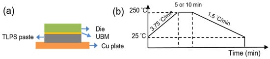 Schematic of the (a) TLPS joints and (b) sintering profile. The sintering temperature (250 °C) was held for 5 or 10 min.