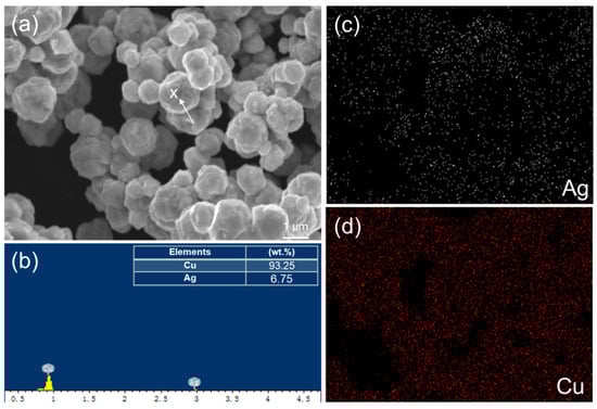 (a) SEM image and EDX analysis of the Ag-coated Cu (Cu94.0Ag6.0) powders. (b) Typical EDX spectrum taken from the white spot labeled as “X” in (a). Elemental mappings of (c) Ag, (d) Cu.