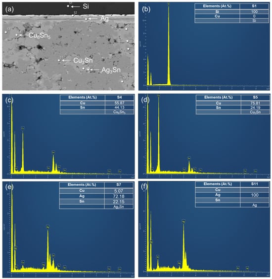 (a) SEM image and EDX analysis of the IMCs taken at the lower region of the joints sintered for 5 min from the 50% Cu fraction powders. (b–f) Typical EDX spectra showing the elemental composition in the white-dotted regions labeled as (s1, s4, s5, s7, and s11).