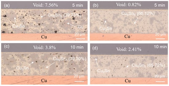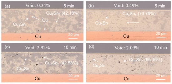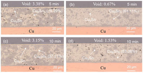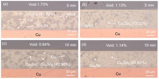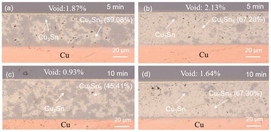 The SEM images of the upper and lower locations of the sintered joints with their elemental compositions are shown in Figure 4 and Figure 5. Most of the Cu powders reacted with the SnAgCu solders. Two main IMCs (Cu6Sn5 and Cu3Sn) and voids were detected in the sintered joints. We also found the significant IMC transformation of Cu6Sn5 to Cu3Sn as the sintering time was extended. The cross-sectional OM images of the sintered joints are shown in Figure 6. Voids and IMCs can be clearly observed. The ratios of the voids and IMCs observed in the cross-sections were acquired using image processing software that the OM was equipped with. It can be seen that the voids are randomly distributed in the sintered joints. The voids formed in the joints (Figure 6a,b) sintered for 5 min with Cu powder fractions of 50% and 40% accounted for 1.72% and 1.13%, respectively. As the sintering time was prolonged to 10 min, the ratio of the voids in the 50%-Cu-fraction joints significantly decreased to 0.64% (Figure 6c). However, no obvious difference in the void ratio was found in the joints sintered with 40% Cu powders (Figure 6d). Additionally, the Cu6Sn5 and Cu3Sn IMCs could be clearly observed in the OM images (Figure 7). The Cu6Sn5 and Cu3Sn IMCs are denoted by the light and dark grays, respectively. We also detected some remaining Cu powder (orange) in the joints after the sintering (Figure 7a,c). The remaining Cu powders in the joints indicated the incomplete sintering of the powders with a 50% Cu fraction. However, no Cu powders were found in the 40%-Cu-fraction joints.