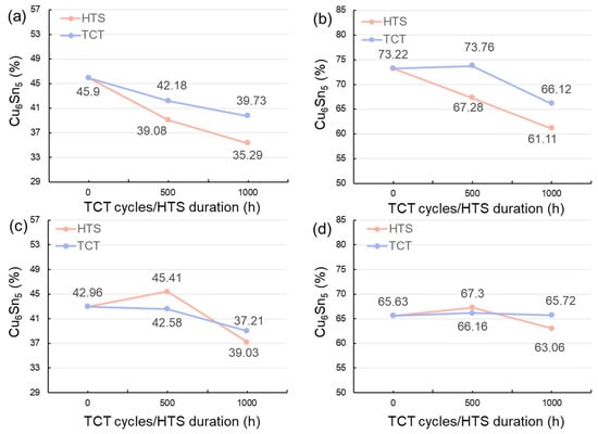 Additionally, it can be seen that an IMC layer formed at the solder–Cu substrate interface during solid state aging (Figure 7, Figure 8, Figure 9 and Figure 10). The Cu6Sn5 IMCs near the interface preferred to transform into Cu3Sn IMCs, according to the reaction (1). The abundant supply of Cu could be from the Cu substrate. The systematic study of the IMC transformation at the solder–Cu substrate interface could be an interesting topic in the future. The ratios of the Cu6Sn5 IMC at some specific periods of the reliability tests are shown in Figure 11. It can be seen that the Cu6Sn5 ratio significantly decreased under HTS and TCTs, whereas the Cu3Sn ratio showed the opposite trend (Figure 11a,b). This indicated that the Cu6Sn5 IMC significantly transformed into the Cu3Sn IMC during the reliability tests. However, the IMC ratios in the joints sintered for a longer time (10 min) remained almost unchanged during the HTS and TCTs (Figure 11c,d). The Cu6Sn5 IMC almost reached its equilibrium state. The results suggest that the longer sintering time stabilized the sintered joints, making them less susceptible to microstructural and mechanical changes under thermal stress.