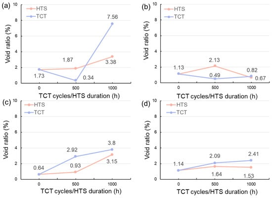 The void ratios in the sintered joints after HTS and TCTs are shown in Figure 12. It can be seen that the void ratio in the 50%-Cu-fraction joints significantly decreased (1.73 to 0.64%) as the sintering time was prolonged from 5 to 10 min (Figure 12a,c). However, the void ratio in the 40%-Cu-fraction joints did not obviously change with the sintering time (Figure 12b,d). Regarding the joints fabricated from the powders with a 50% fraction of Cu, the void ratio generally increased with increased HTS duration and thermal cycling cycles (Figure 12a,c). However, no obvious changes in the void ratios of the 40%-Cu-fraction joints were found. The results indicate that the formation of voids in the low-Cu-fraction joints was relatively stable and not affected by the thermal stressing. As aforementioned (Figure 6), some Cu powders remained in the 50%-Cu-fraction joints whereas no Cu powders were found in the 40%-Cu-fraction joints. The changes in the void ratios could be attributed to the presence of the remaining Cu powders subjected to thermal stressing.