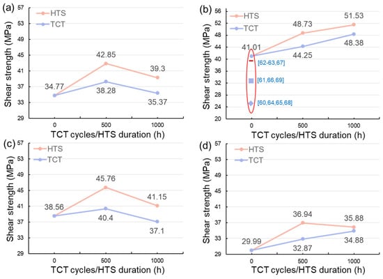 Shearing strength of the sintered joints before and after HTS and TCTs. The joints were sintered with (a,c) 50 wt% and (b,d) 40 wt% Cu powders for 5 and 10 min.
