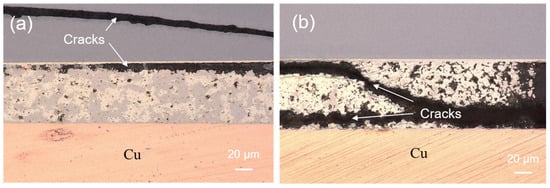 Cross-sectional OM images showing fractures at the edges of the joints sintered with (a) 50 wt% and (b) 40 wt% Cu powders for 5 and 10 min, respectively, after subjecting to 1000 thermal cycles.