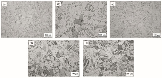Microstructure of different GH4742 test alloys: (a) alloy 1; (b) alloy 2; (c) alloy 3; (d) alloy 4; (e) alloy 5.
