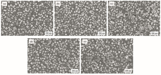 SEM images of γ′ phase of different GH4742 test alloys: (a) alloy 1; (b) alloy 2; (c) alloy 3; (d) alloy 4; (e) alloy 5.