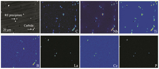 In order to show the synergistic effects of RE and B on precipitates, EPMA was applied to observe the morphology and measure the element distribution of precipitates. The results in test alloy 5 are shown in Figure 4. Large amounts of carbides containing C, Nb, Ti and B elements were observed to be precipitated at the grain boundaries. In addition, fine spherical or ellipsoidal RE compounds containing La, Ce and P elements were found to be distributed with a size of less than 2 μm near the grain boundaries. The results above showed that after B and RE alloying, B and RE may combine with small amounts of other elements to form more complicated oxides, sulfides or complex inclusions.