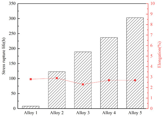 The results of stress rupture properties are given in Table 2 and Figure 5. It was indicated that the addition of B as a single element significantly increased the stress rupture life from 8 h (alloy 1) to 189 h (alloy 3). When a certain amount of RE elements was added to the test alloys, the synergistic effects of B and RE were fully exerted, showing that the stress rupture life had improved to 237 h (alloy 4) and 303 h (alloy 5), respectively. Therefore, a combination of B and RE can significantly improve the stress rupture properties.