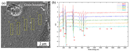 Due to the different atomic size and chemical properties between Ni and trace elements, B and RE tend to segregate towards grain boundaries. In order to study element segregation more clearly, five equidistant areas close to the grain boundary were selected for quantitative analysis. A schematic diagram of the selected areas and the AES spectrum are shown in Figure 7. From the results above, the element content was accurately characterized. Table 3 shows the distribution of elements at different positions from grain boundaries in test alloy 5. It can be seen that the content of B in Area 1 near the grain boundary was the highest (6.02%), and the content of B gradually decreased to 4.89% (Area 2), 0.70% (Area 3) and 0.01 (Area 4 and Area 5) as the distance from the grain boundary increased. Although the content of B was not very accurate due to its low addition, it was fully proved that the segregation of B towards the grain boundary was strong. The content of C in Area 1 was also high (13.33%), and the content of C decreased significantly as the distance from the grain boundary increased. The contents of Nb and Ti near the grain boundary were also high, which indicated that carbides precipitated along the grain boundaries. In contrast, the contents of Al, Cr and Co near the grain boundary were much lower than those in the grain, making it clear that these three elements were depleted along the grain boundaries. The contents of Mo and Ti changed minimally. It is noteworthy that no effective contents of RE were detected due to the trace contents.