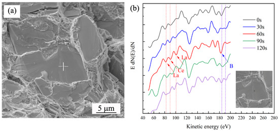 Due to the particularity of RE and the fact that the content of RE was not detected in the full spectrum in Figure 7, we designed a specific experiment. A special intergranular fracture surface was prepared, and the variation in the RE and B content sputtered at different times was measured. The AES spectrum in Figure 8 proves the segregation of B and RE elements in alloy 5. Reports have shown that the kinetic energy range of Ce and La is from 52 eV to 115 eV. Typical Auger peaks of La (64 eV, 83 eV and 99 eV) and Ce (68 eV, 87 eV and 104 eV) were chosen for detection. The Auger peak of B was at 185 eV. The change in the inner energy level was caused by the transfer of atomic charge, thus changing the energy of the Auger transition and leading to the displacement of Auger peaks [25,26]. The spectra lines had a minor difference compared to the standard peaks in the Auger Electron Spectroscopy Reference Manual [27].