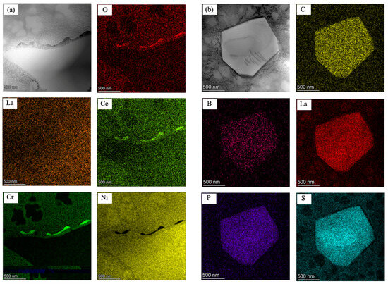 Figure 9 manifested two types of precipitates along grain boundaries and their corresponding EDS mappings. The results showed that the nano-scale continuous irregular stirps were enriched with Ce, O and Cr, indicating that the precipitate was an RE compound with a size of less than 500 nm (Figure 9a). Another precipitate was determined as a complex inclusion containing C, B, La, P and S, with an irregular bulk shape (Figure 9b). It was seemingly confirmed that RE elements tend to combine with O and S preferentially, which coincides with the results of a previous study [30,31].