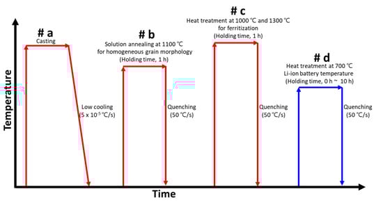 The as-cast AISI2507 was air-cooled (#a); however, it exhibited precipitation, which led to cracking during subsequent processing. Solution annealing (#b) was performed to stabilize the composition and microstructure of AISI2507. The solution annealing of AISI2507 involved heating to 1100 °C, where the volume fractions of austenite and ferrite became equal, followed by rapid cooling at a rate of 50 °C/s. Subsequently, to observe the microstructural changes at 700 °C, the specimens were further subjected to ferritization annealing by heating to 1300 °C for 1 h and then rapidly cooling at 50 °C/s (#c). Subsequently, heat treatments were conducted at 700 °C for durations ranging from 0 to 10 h to (#d) examine both microstructure and electrochemical behavior.