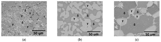Microstructure (γ: austenite, δ: ferrite) of super duplex stainless steel AISI2507: (a) cast’s microstructure, (b) microstructure subjected to heat treatment at 1100 °C, and (c) microstructure subjected to heat treatment at 1300 °C.