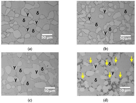 Microstructure (γ: austenite, δ: ferrite) of super duplex stainless steel AISI2507: (a) heat treatment for (a) 0 h at 700 °C; (b) heat treatment for 1 h at 700 °C; (c) heat treatment for 5 h at 700 °C; and (d) heat treatment for 10 h at 700 °C with secondary phases indicated by yellow arrows.
