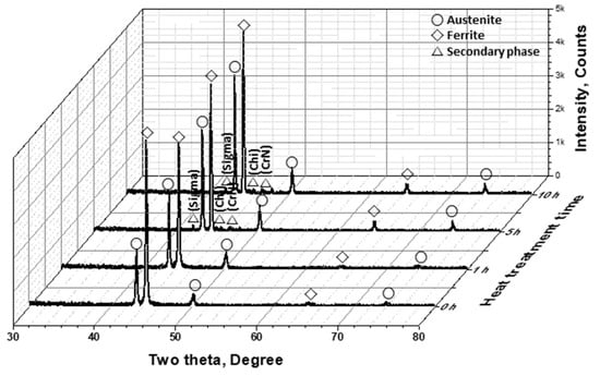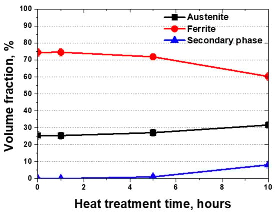 Upon exposure to 700 °C, AISI2507 exhibited variations in the volume fraction, as shown in Figure 5 and Table 3. Following a 10 h exposure at 700 °C, the fraction of austenite increased from 25.5% to 31.6%, accompanied by the precipitation of secondary phases [,,]. As the fractions of the austenite and secondary phases increased, the ferrite fraction decreased. In particular, the precipitation of secondary phases occurred as the austenite expanded, resulting in the transformation of ferrite and a subsequent decrease in its volume fraction.