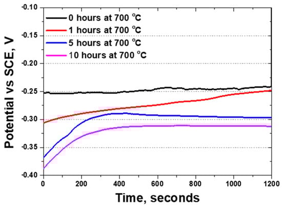 Although the potentials of pure metals can be directly calculated, the potentials of alloys or surface-treated materials cannot be determined using calculations alone. Hence, by analyzing the reactivity of materials via the OCP, the onset of oxidation and reduction reactions can be compared. OCP measurements were conducted over varying durations of exposure to 700 °C (Figure 6). As the heat treatment duration increased, the potential tended to increase. However, following the precipitation of secondary phases, the potential decreased from −0.25 to −0.32 V. Before the precipitation of secondary phases, an imbalance in the fraction of austenite and ferrite resulted in a lower OCP, which was subsequently elevated by the growth of austenite [,,]. However, the precipitation of secondary phases led to a decrease in the potential from −0.25 V to −0.32 V.