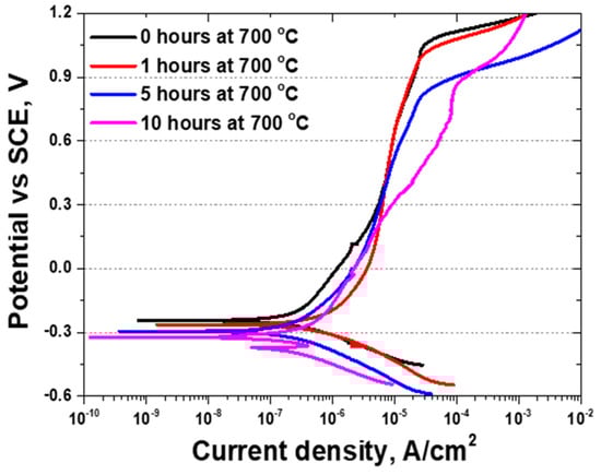 The results of the potentiodynamic polarization test, which evaluates the variation in current density with potential, are shown in Figure 7. This test revealed that, at the active polarization curve of the potentiodynamic polarization curve, the current density (Icorr) increased from 8 × 10−6 A/cm2 to 3 × 10−6 A/cm2 as the potential decreased from −0.6 V to 1.2 V. Despite the potential increase, the current density remained stable owing to a passivation layer, and a significant increase in the current density was observed beyond the corrosion potential (Ecorr). This corrosion behavior is characteristic of stainless steel, with SDSS exhibiting a high potential (Epit, pitting potential, breaking passivation layer). The influence of secondary phases was investigated upon exposure to 700 °C for 10 h, exhibiting an increase in the volume fraction of secondary phases up to 8.1%, which resulted in a double activation polarization curve being attributed to these phases [,].